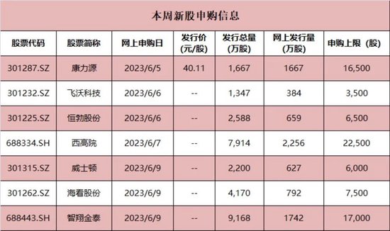 本周(6月5日—6月9日),共有7只新股将进行申购,其中创业板5只(康力源、飞沃科技、恒勃股份、威士顿、海看股份)、科创板2只(西高院、智翔金泰)。