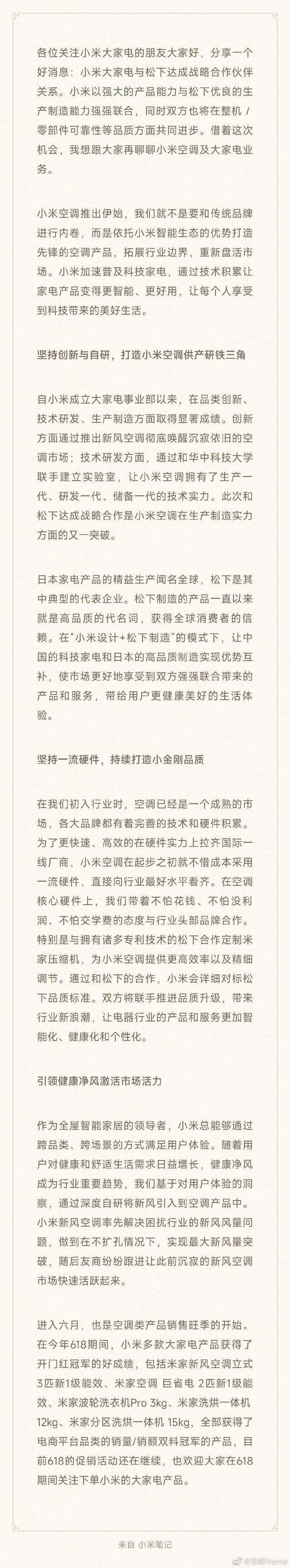 日前,小米大家电与松下官宣配合。按照小米高档副总裁、大家电部总裁张峰在酬酢平台公布的信息,两边的配合花式是“小米盘算推算+松下制造”。也即是说,松下成为小米大家电的代工企业。